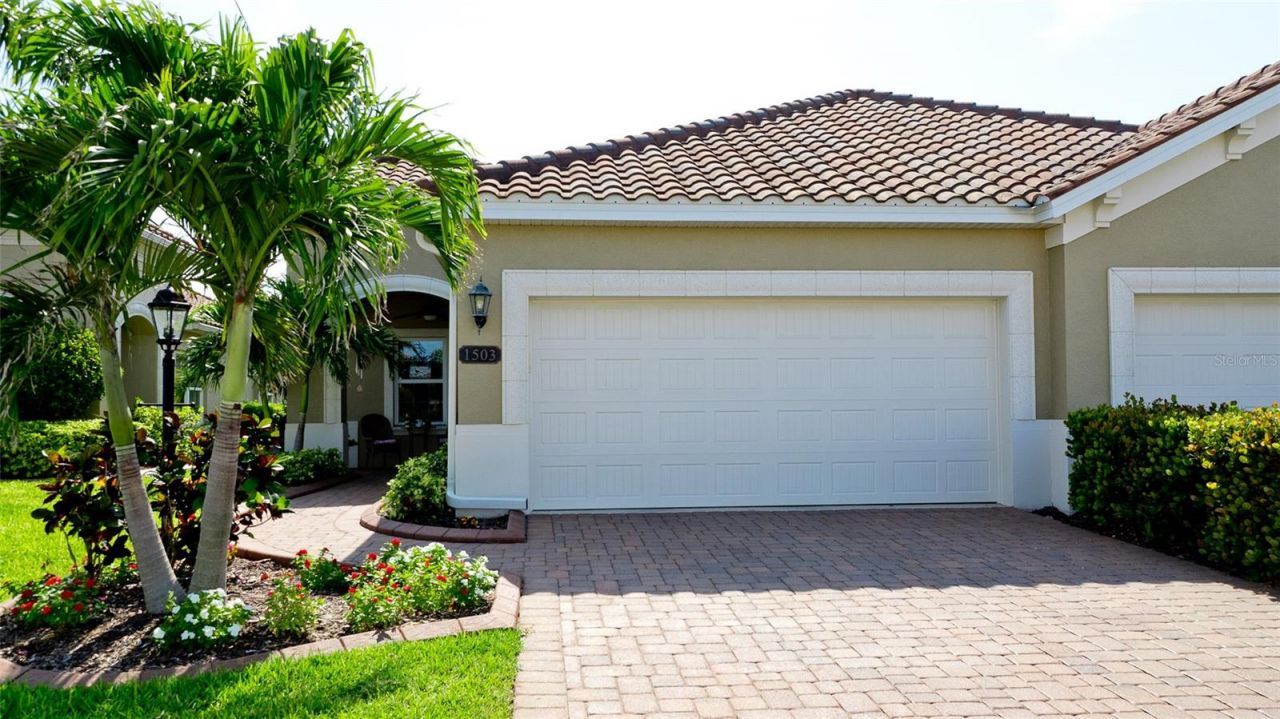 Award winning Leeds Platinum built villa. Upgrades include Porcelain plank flooring in all but baths and Sun Room. Crown Molding in Liv./Kit/Din., 5.5 in baseboard in all but baths and laundry room, Hurricane impact windows in Sun Rm, Hurricane shutters for remaining windows. Upgraded faucets throughout. Grade 2 cabinets including laundry room. Built in shelf for storage in laundry room. Quartz countertops, upgraded range, refrigerator, washer, dryer. A true Great Room/Open concept including the dimensions for kitchen, living room and dining area. Master BR has large walk-in closet and regular closet with double shelving. Guest bedroom has a walk-in closet with extra shelving. Upgraded decorative wall tile in tub and shower areas. 8 ceiling fans including bathrooms. Pull down stairs in garage and professional floor finish in garage. Shelves and storage racks in garage included. Extra electrical outlets in garage. Gated Entry. Pool refurfaced Oct. 2025.Security cameras at gated entrance and amenity center. Fitness center. Pickle board court and dog park are popular with residents.Must see to appreciate the pristine care during the original ownership.
