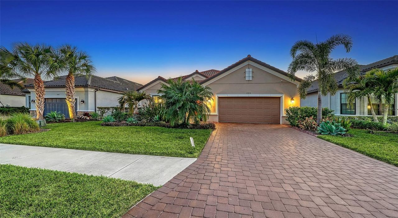 Most sought after golf-deeded Pallazio in Esplanade Azario with the rare and stunning lake and golf views! This home is being offered furnished (some exclusions apply, and yes that is negotiable). Before entering the home, you will be wowed by the gorgeous outdoor landscaping that warms the heart. As you enter this beautiful three-bedroom, three-bath-plus-den home, you will notice all exquisite custom designs in this open floor plan. Beautiful laminate flooring, plantation shutters throughout, tray ceilings and crown molding, designer lighting and fixtures, gourmet kitchen with quartz countertops and soft-close everything. The primary en suite has a lovely sitting area and spa-like bath adjacent to a custom built-in closet. There is a whole-house water filtration and softener, security cameras front and back with home security system. For hurricane protection, there are accordion-style smart guard shutters and a MagnaTrack screen on the lanai. As for storage, the kitchen pantry and main closets have custom built-ins, and the epoxy-finished flooring in the extended garage has two hanging storage units. Go outside to view your personal piece of paradise with the southwest facing views of water and golf (16th hole). With an outdoor kitchen and expanded lanai, here you will experience the most beautiful, peaceful and private sunsets. If you desire a pool and spa, here is your blank canvas with the best backdrop and views awaiting your design. Esplanade at Azario offers world-class amenities including an 18-hole championship golf course, pro shop, culinary center, fitness center, full-service spa, six tennis courts, 16 pickleball courts, a resort-style pool, Bahama Bar & Restaurant, coffee shop and casual pizzeria. (CDD fee is included in annual tax amount.) Ideally near Sarasota's finest dining, shopping and award-winning Gulf Coast beaches, this home captures the essence of luxury, leisure and lifestyle.