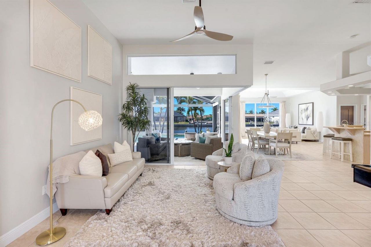 WESTERN EXPOSURE, GULF ACCESS, AND 240 FEET OF WIDE WATER VIEWS. You feel the difference when you walk in the door. Light, airy, bright, warm and inviting describes the feeling it gives you knowing that careful consideration, time and thought, went into the tasteful upgrades. Western exposure and sweeping canal frontage define this beautifully maintained Gulf access residence, positioned on an oversized lot along a 240-foot-wide canal. From the moment you arrive, the barrel tile roof (new 2023), lush local foliage, lava rock with stamped concrete border, and expansive stamped concrete driveway create a striking first impression, leading to the 3-car garage and inviting front sitting patio. French doors open to an airy interior with high ceilings, transom windows, tray ceiling detail in the family room, and tile flooring throughout. Ninety-degree and pocket sliders frame uninterrupted wide water views and extend the living space effortlessly outdoors. The kitchen is equipped with a new Whirlpool appliance package including double ovens, modern pulls, updated lighting and plumbing fixtures, and a dry bar designed for entertaining. The primary suite offers dual walk-in closets with built-in systems, a decorative fireplace, pocket sliders to the lanai, dual vanities with makeup counter, soaking tub, and a spacious walk-in shower with multiple shower heads. One guest bedroom features an en-suite bath, while another offers a generous double closet. The laundry room includes upper cabinetry, sink, and pantry storage. Outdoor living is exceptional with a saltwater heated pool featuring a waterfall, picture-window screen enclosure, and a lanai and pool deck replaced in Spring 2023 with textured matte tile. A new summer kitchen with propane grill and refrigerator enhances the space, while partial privacy fencing and Eureka palms provide natural screening. The dock is structurally sound with wrapped pilings. All mechanical systems are under six years old. Wide water views and direct Gulf access complete the Southwest Florida waterfront lifestyle. Ideally located in Southwest Cape Coral near shopping, dining, marinas, and waterfront restaurants, with convenient access to Cape Harbour, Tarpon Point, and the Cape Coral Parkway corridor, this property offers both privacy and proximity to the best of the area.