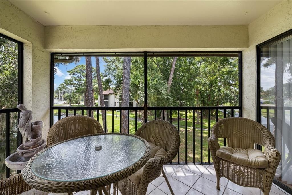Beautiful second floor corner condo, 2 BEDROOMS AND 2 FULL BATHS , the Guest Suite has a tub, and the Primary bedroom has a shower. Owned by seller since 1990 and Used as a second home, never rented, so owner says: it LOOKS like new. It is located near and in view of the clubhouse and pool, just a short walk away. Sellers spent $14,000 on the kitchen upgrades in recent years, the rich wood tone of the kitchen cabinets are matched with the new finish on the pantry door as well as on the one of a kind HIGH Table and chairs in the kitchen nook where you have a great view .. You can relax on the screened back porch which overlooks the nearby pool & Clubhouse area. There is an Electric BBQ for your cooking needs and there is also a BBQ area at the Clubhouse. The living room features an Electric fireplace, it can provide blown heat or just a flaming light show . HIGH CEILING FROM 12 FEET SLOPES DOWN TO 8 FEET. Comfortable furnishings will remain with the unit at the sale. The bedrooms have laminate floors and ceramic tile is in the kitchen, porch, baths and the living areas. The owners just re-painted most areas.
