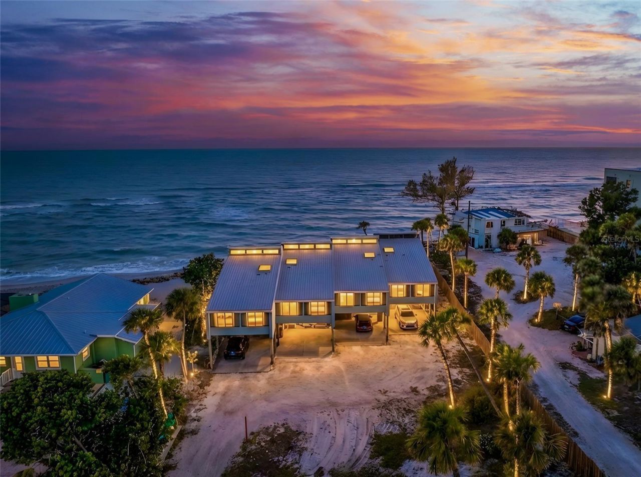 Welcome to Banyan Bluff Condominiums, a private four-residence townhome community set directly along the Gulf front of Manasota Key in Englewood, Florida. This lovely 3-bedroom, 2-bath multi-level townhome offers privacy and a tranquil atmosphere, positioned on more than an acre and comfortably set back from North Beach Road for added seclusion. The first living level is elevated on pilings approximately 16 feet above sea level, and the layout maximizes sweeping Gulf views and breathtaking sunsets from most rooms. A covered balcony off the main living area creates an inviting indoor-outdoor living space, ideal for dining outside or unwinding at day's end. The beautifully updated kitchen includes new stainless steel appliances and quartz countertops. Upstairs, the top floor primary bedroom suite offers a vaulted ceiling, walk-in closet, an updated en-suite bathroom, and recently replaced storm-rated sliders that open to a private open balcony overlooking the Gulf. Both guest bedrooms include storm-rated windows and the guest bathroom is located just beyond the kitchen and adjoining dining area. Convenient parking includes two under-building spaces and an EV charging port. The tiled entry foyer includes an adjoining utility room with a new washer/dryer, utility sink and room for storage. The townhome is being offered turnkey furnished. Whether you choose to make it your own or place it in a rental program, this condo offers outstanding versatility. Banyan Bluff residents also enjoy a Gulf-front wooden deck, perfect for soaking up the sun or enjoying evening sunsets. Other notable updates include a metal roof in 2023, a newer electrical panel, and tankless water heater. A rare opportunity to own a stunning beachfront townhome in a quiet, exclusive setting.