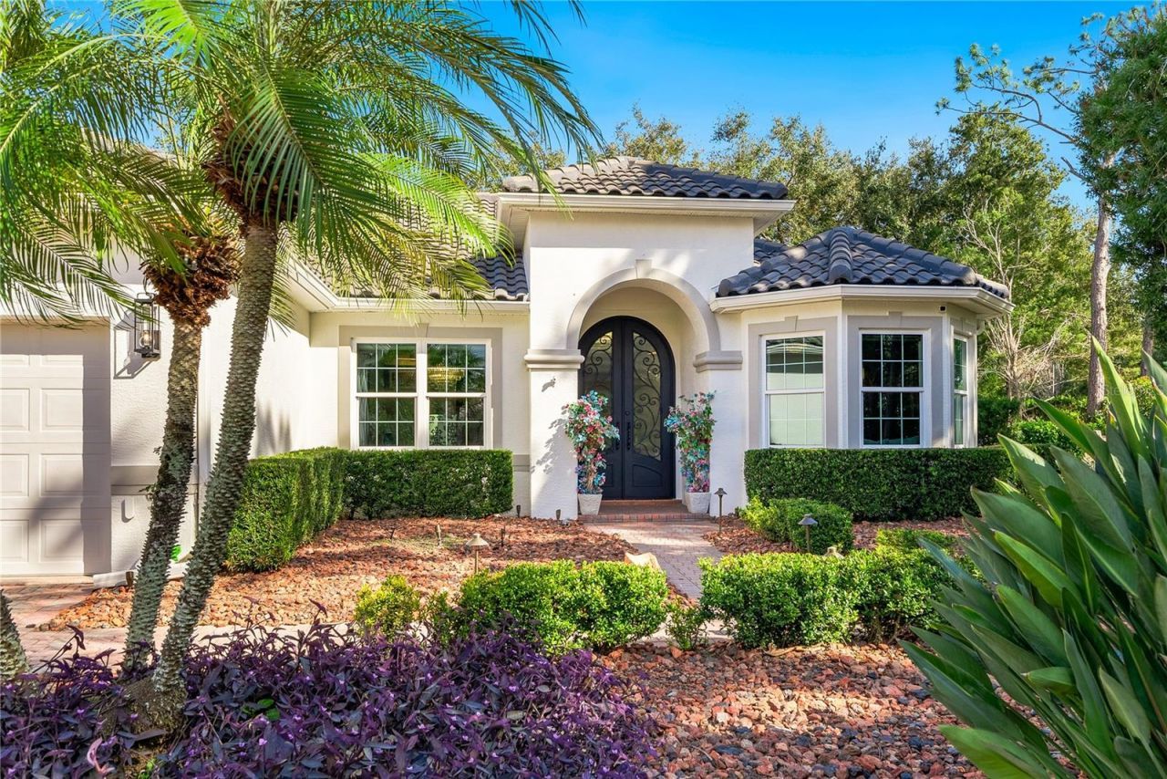 Extraordinary designer pool home showcasing over $750,000 in upgrades, this 2 bedroom, 2 bath residence offers 1,675 sq ft of impeccably curated living space where every detail has been thoughtfully selected from floor to ceiling. Truly a 'must-see smart home, blending elegance, technology, and comfort. From the moment you arrive, you're greeted by designer iron arched front doors, lush tropical landscaping with stone accents and elegant lighting, and impact-rated windows and doors throughout. Inside, 24 x 48 porcelain tile floors, vaulted ceilings, wood-trimmed entryways, 8' solid-core doors, crown molding, and 51/4 baseboards set the tone for refined living .The stunning, open-concept kitchen is a showpiece, featuring rich solid wood cabinetry with designer hardware, quartz countertops, a chair-height island, custom tile backsplash extending to the island front, buffet cabinetry, pantry with built-in coffee station and plumbed water line, pot filler, appliance lift, butcher-style stainless sink, soft-close drawers, and stainless steel appliances including a custom brass hood.The great room impresses with a marble-accented TV wall, custom wall detailing, and sliders leading to the lanai. A beautifully crafted built-in highlights the dining area, while the den features a bay-style window with seating and storage plus custom ceiling detail.The primary suite is a private retreat with sliders to the lanai, coffered ceiling, applied wall molding with designer wallpaper, customized walk-in closets, and a spa-like bath offering dual quartz vanities, decorative mirrors, linen tower, soaking tub with niche, and a luxurious shower with handheld controls compatible with Alexa. A mirrored 'secret door leads directly to the laundry from the primary suite. Outdoor living is exceptional with a rectangular heated saltwater pool, marble tile deck, stone columns, and lush landscaping creating a private resort-style setting.Additional features include spray foam attic insulation, painted garage floors, overhead storage racks, pull-down attic stairs, garage refrigerator, shoe storage cabinet, four TVs (great room, primary bedroom, den, and lanai), safe in primary closet, and a hand-carved statue of David in the entry that conveys with the home. This gem is a 'Wow from floor to ceiling!